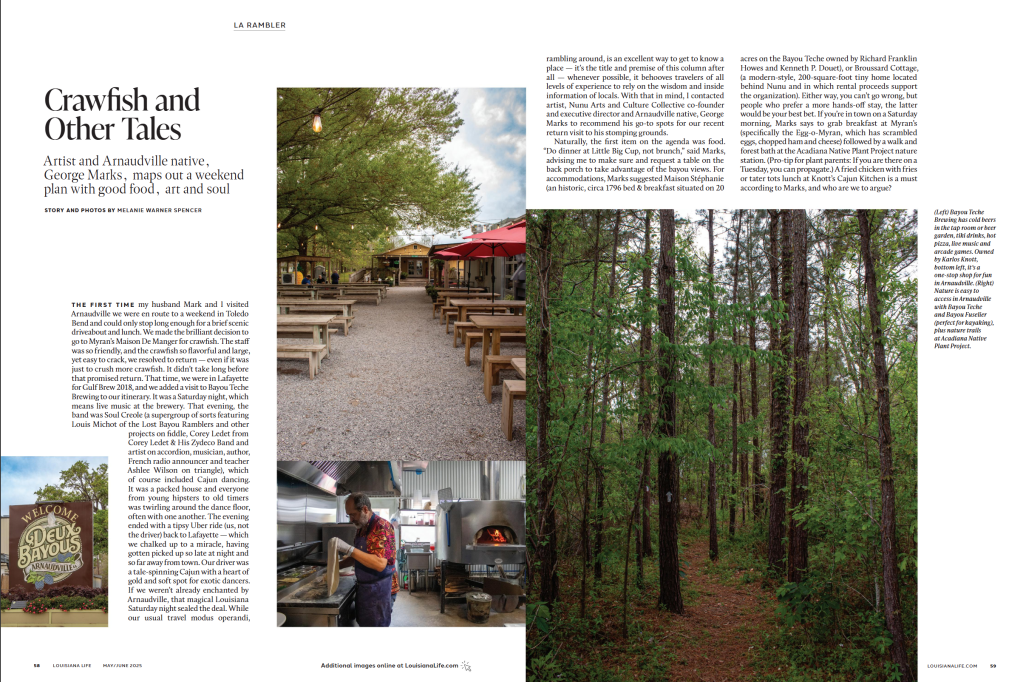 Artist George Marks Recommends His Go-to Spots in Arnaudville: Maps out a weekend plan with good food, art and soul, Louisiana Life, LA Rambler Column, May-June 2025